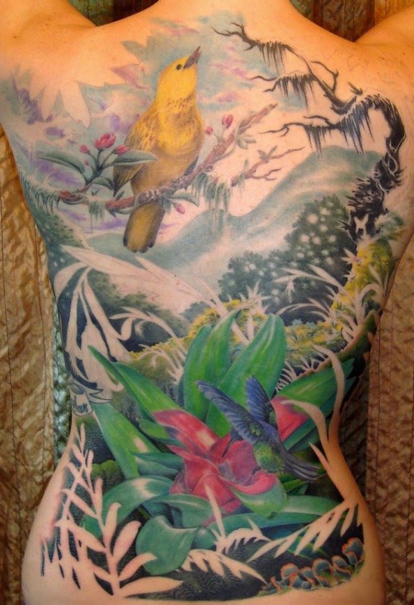 背部完美的彩色小鸟花卉世外桃源纹身图案