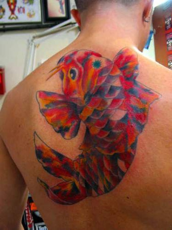背部五颜六色的锦鲤鱼纹身图案
