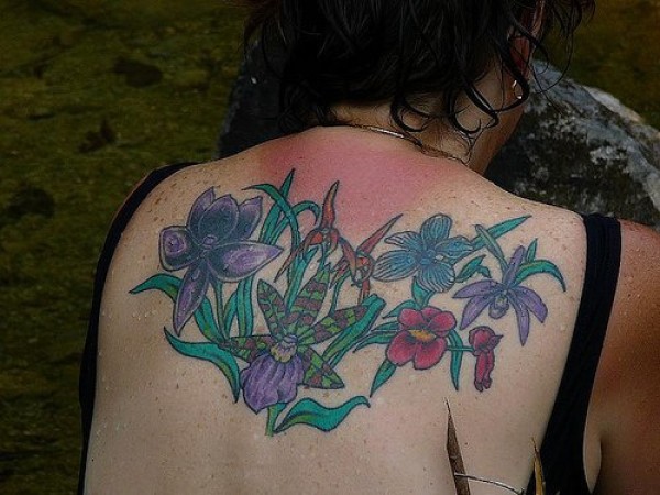 背部彩色不同品种的兰花纹身图案