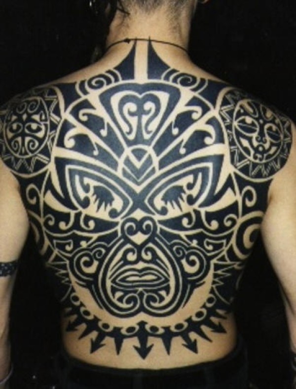 男性背部黑色的毛利部图腾纹身图案