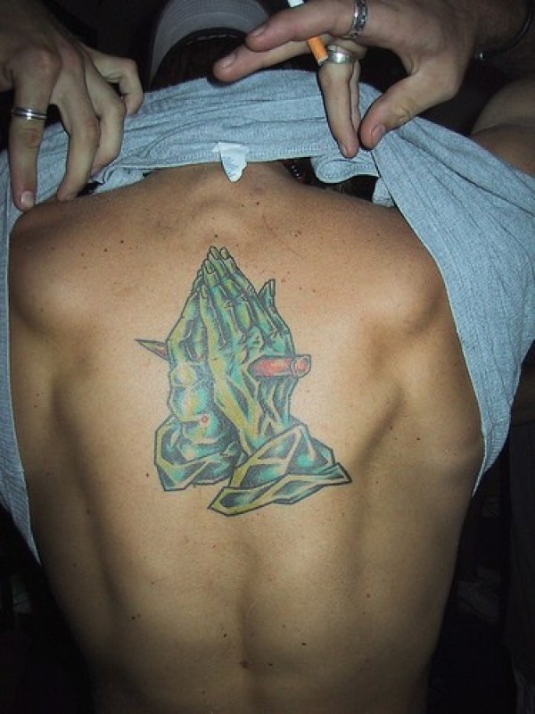 背部彩色的僵尸祈祷手纹身图案