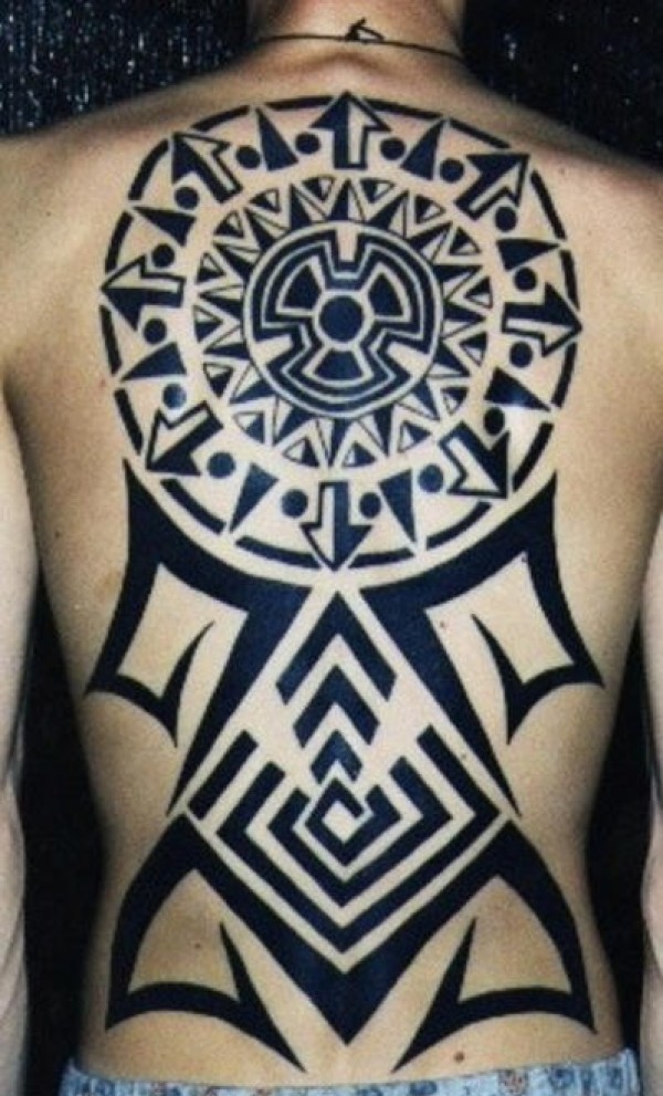 背部黑色圆圈部落符号纹身图案