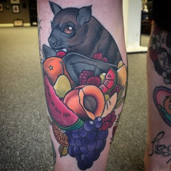 小腿彩色的可爱蝙蝠与水果纹身图案