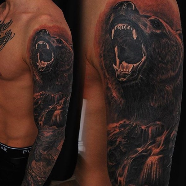 手臂全新流派彩色咆哮熊与瀑布纹身图案