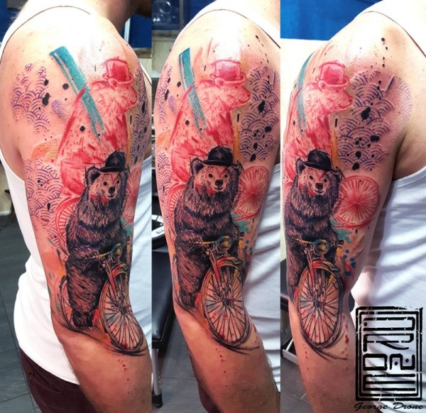大臂现代风格彩色有趣的熊骑自行车纹身图案