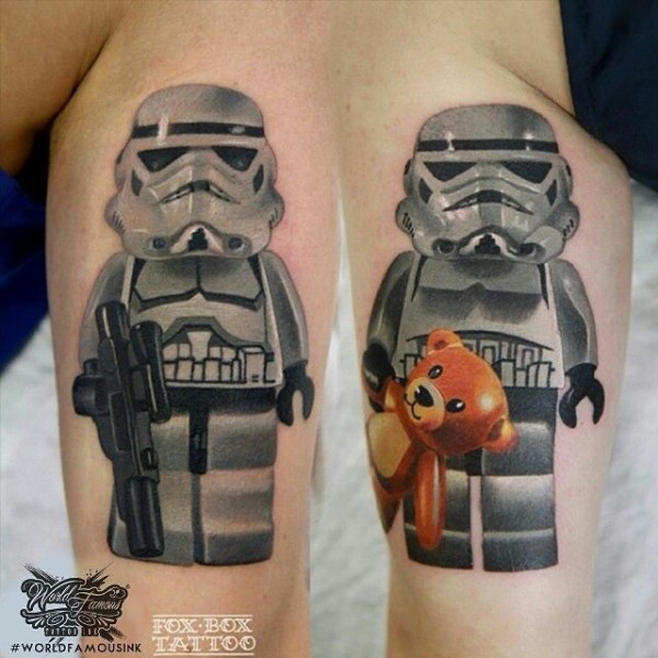 大臂乐高风格有趣的冲击波和小熊纹身图案