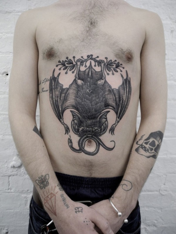 腹部雕刻风格黑色蝙蝠与蛇纹身图案