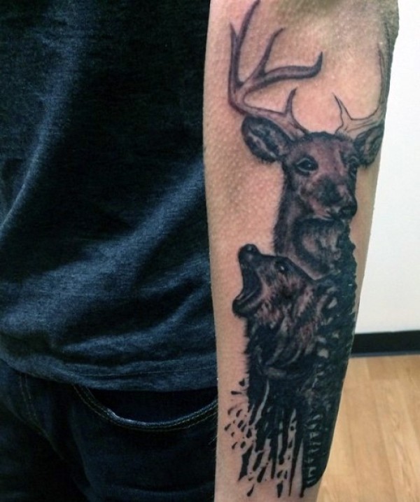 手臂黑色水彩风格咆哮熊和鹿纹身图案