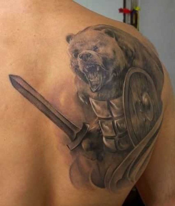 背部难以置信的黑白大熊与盔甲纹身图案