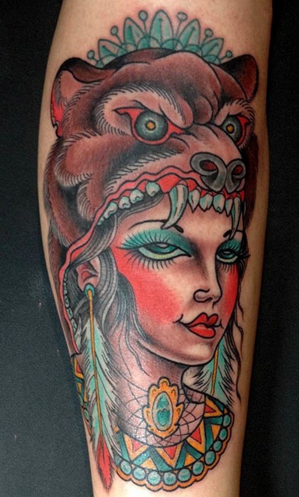 ,old school彩色部落妇女肖像与熊头盔纹身图案