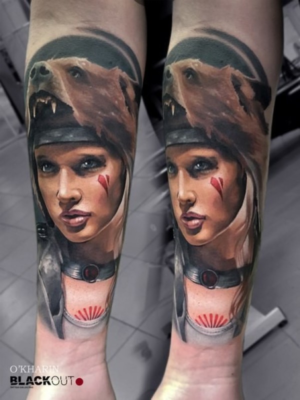 小臂新传统风格彩色熊头女人肖像纹身图案