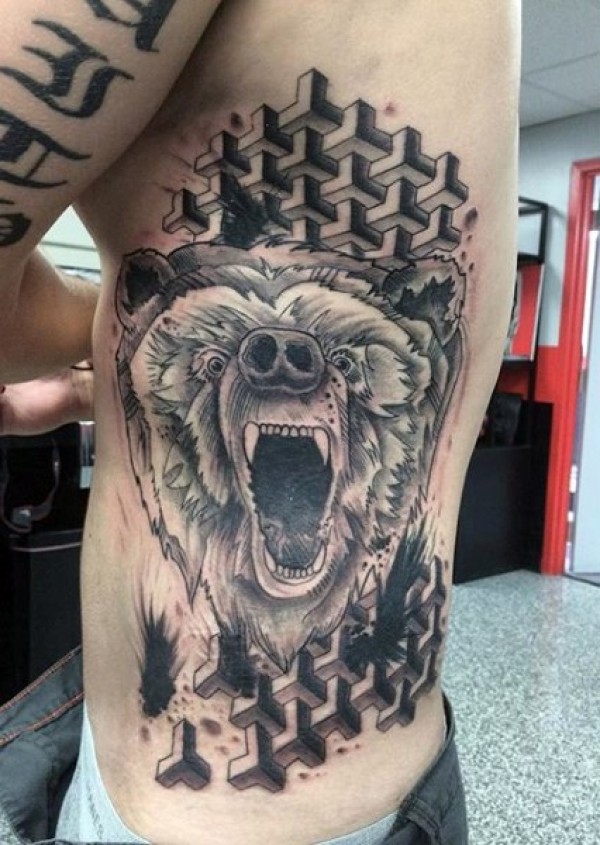 侧肋黑白咆哮熊与饰品纹身图案