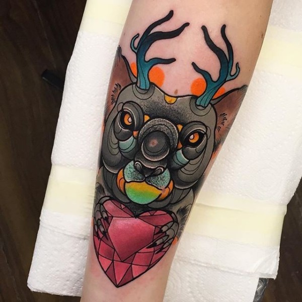 小臂现代传统风格彩色神秘熊鹿角纹身图案