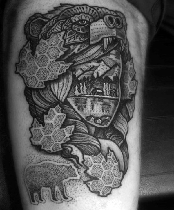 超现实主义风格黑白女人剪影与熊头盔纹身图案