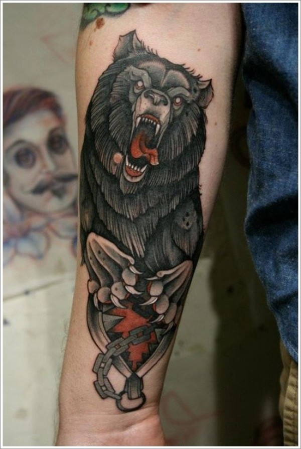 手臂彩色的灰熊与铁链纹身图案