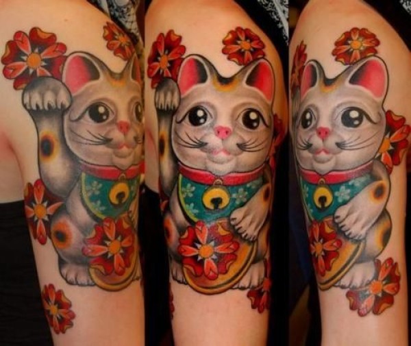 手臂漂亮的彩色招财猫和红色花朵纹身图案