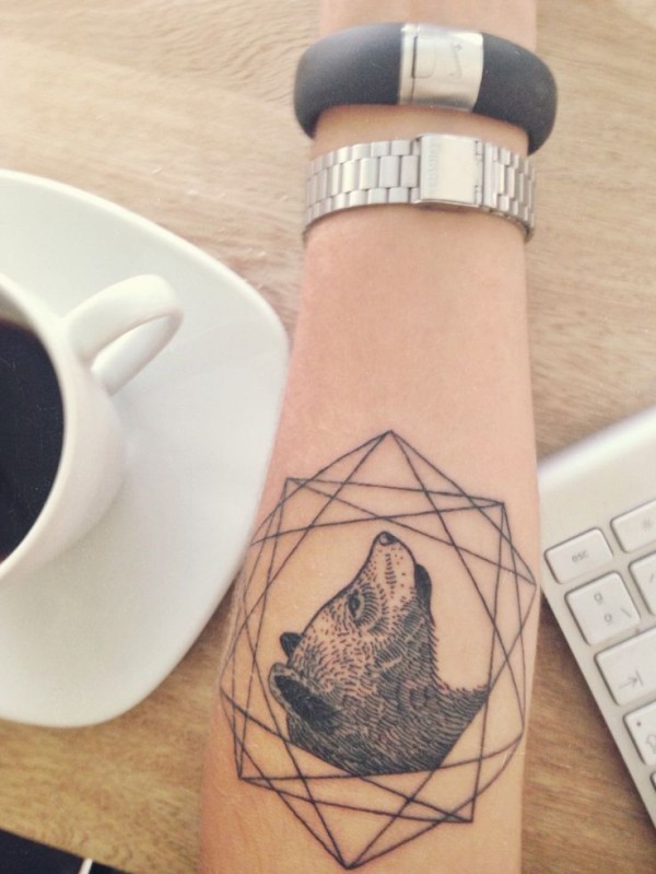 手臂黑色的几何与熊头像纹身图案