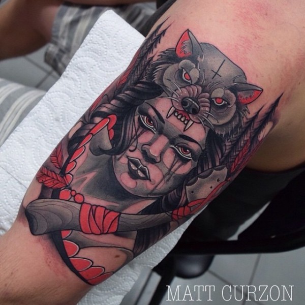 大臂彩色的女人与斧头和狼头盔纹身图案