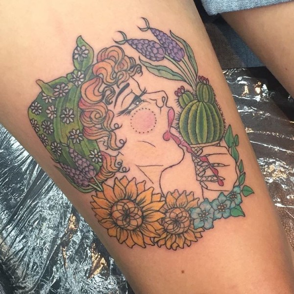 大腿new school彩色女人与植物纹身图案