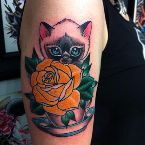 大臂可爱的彩色猫与杯子和玫瑰纹身图案