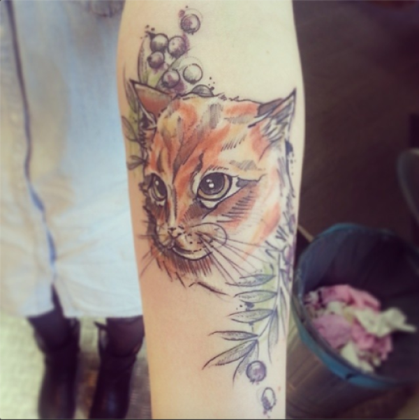手臂漂亮的彩色浆果和可爱猫纹身图案