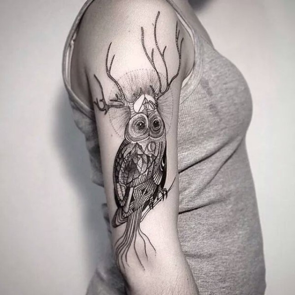 大臂美丽的黑灰猫头鹰与鹿角纹身图案