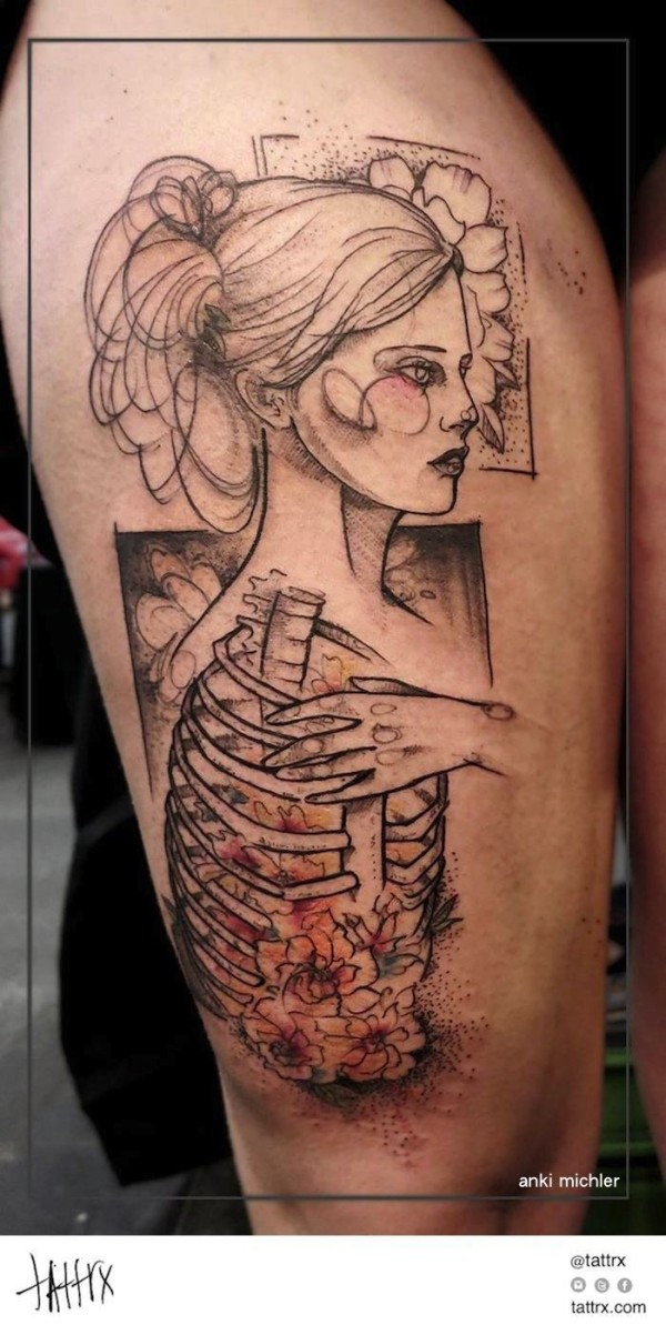 大腿素描风格黑色线条女人与骨架花朵纹身图案