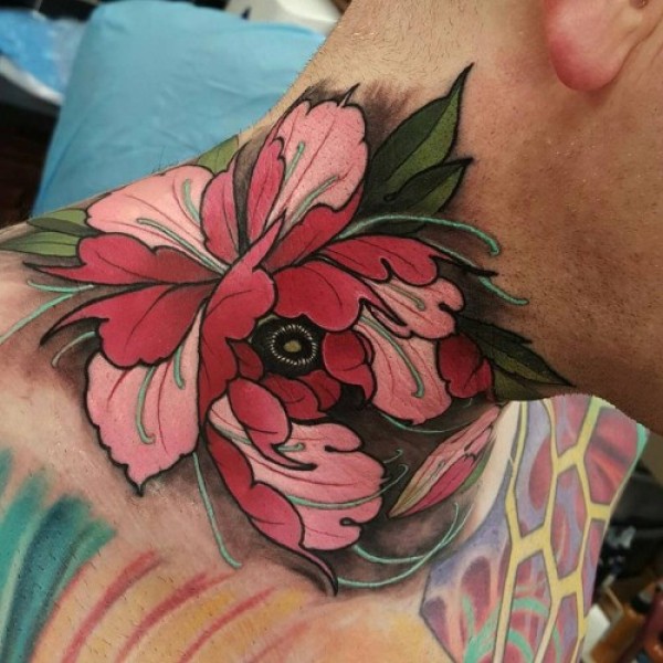脖子彩色非常漂亮的花朵纹身图案