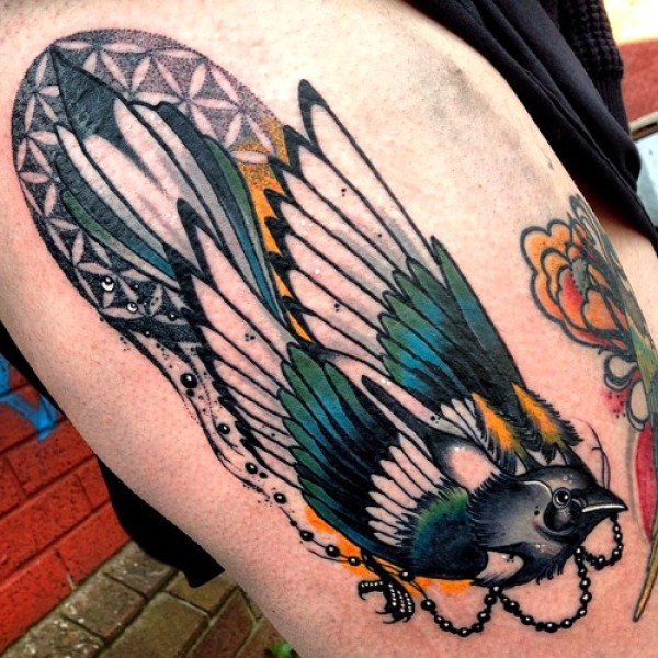 大腿new school彩色美丽的鸟纹身图案