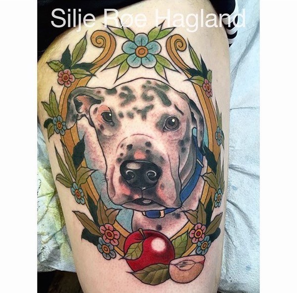 大腿手绘风格彩色的狗花朵和苹果纹身图案