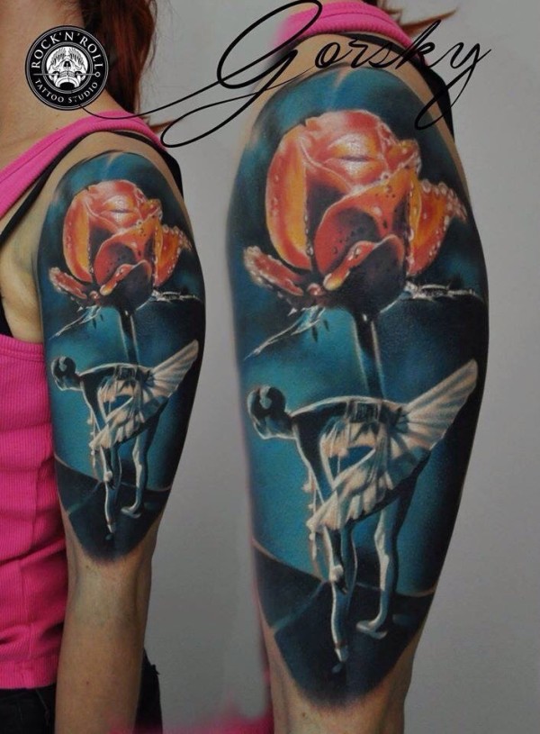 大臂写实彩色红玫瑰和芭蕾舞演员纹身图案