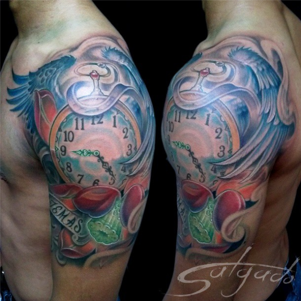 大臂美丽的插画风格色翅膀和花朵时钟纹身图案