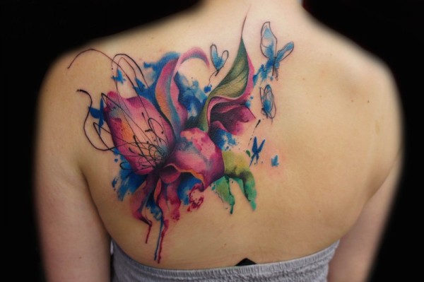 背部漂亮的彩色大花朵纹身图案