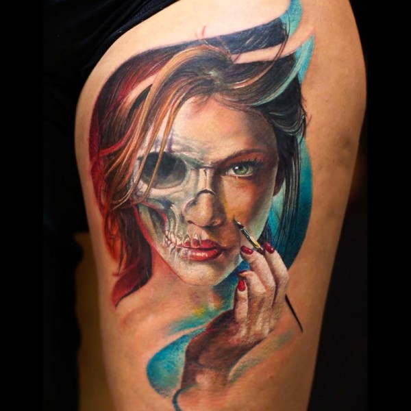 大腿彩色的神秘女人与骷髅结合纹身图案