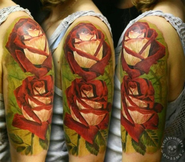 大臂写实风格彩色美丽的玫瑰纹身图案