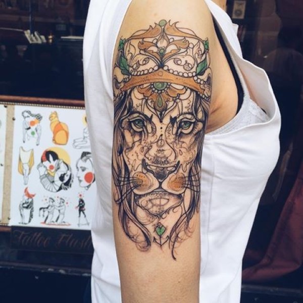 大臂素描风格彩色的狮子皇冠纹身图案