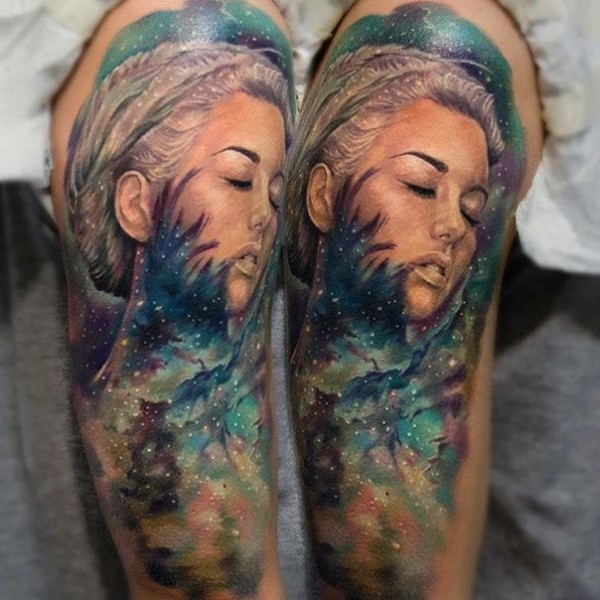 大臂现代风格彩色星空与女性肖像纹身图案