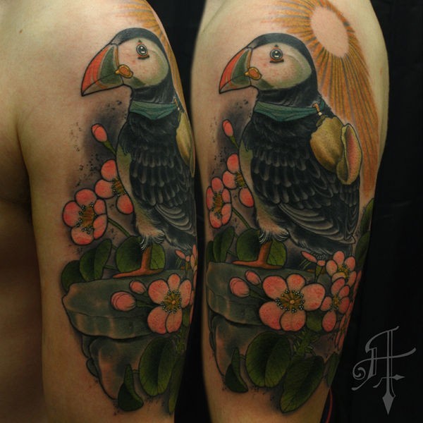 大臂新传统风格彩色的鸟和花朵纹身图案