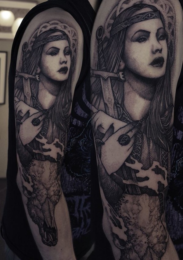 手臂雕刻风格黑色的美丽女人与剑纹身图案