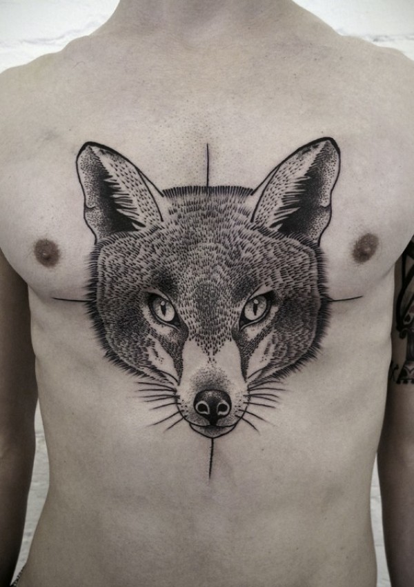胸部黑色漂亮的狐狸头纹身图案
