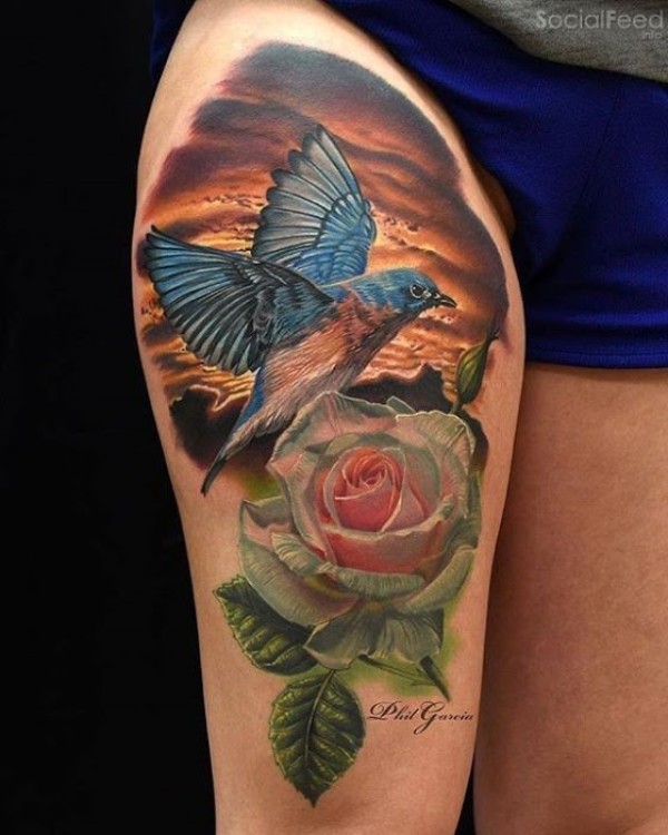 大腿天然逼真的彩色蜂鸟与玫瑰纹身图案