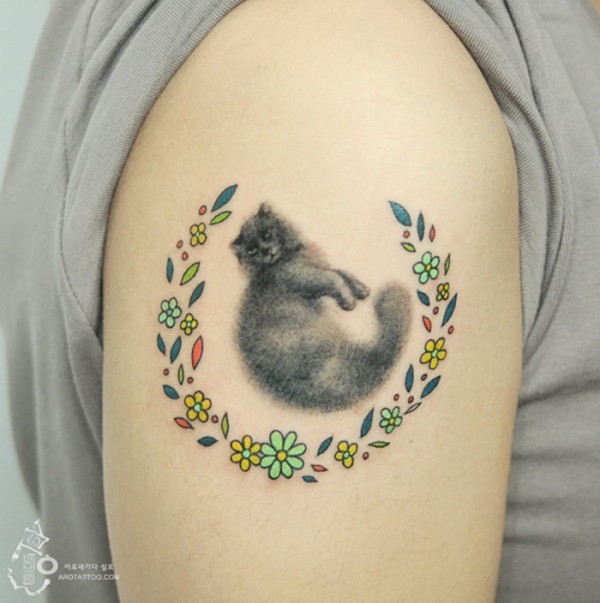 大臂美丽的彩色猫与花朵纹身图案