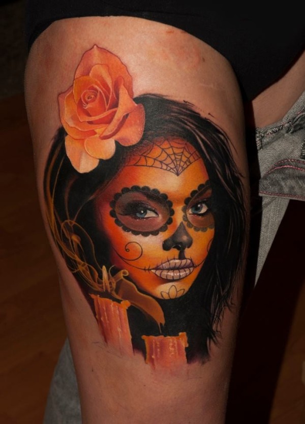 大腿彩色墨西哥妇女肖像与鲜花和蜡烛纹身图案