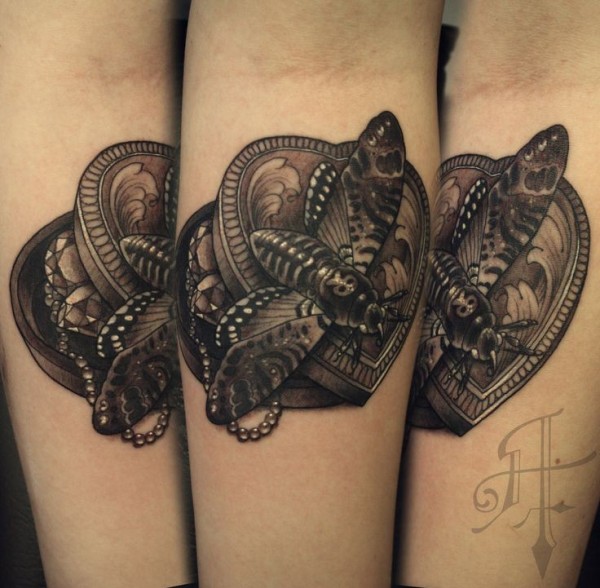 小臂黑灰蝴蝶心形首饰盒纹身图案