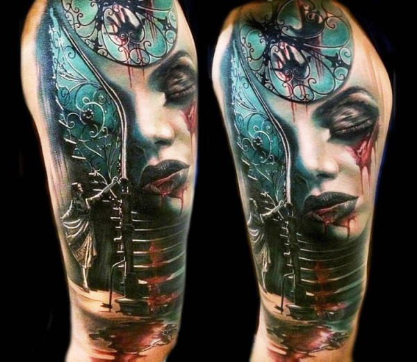 大臂彩色的毛骨悚然女人与楼梯纹身图案
