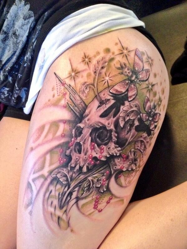 大腿美丽的彩色骷髅与蝴蝶纹身图案