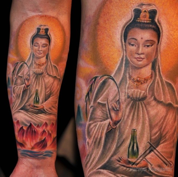 手臂美丽的彩色观音与莲花座纹身图案