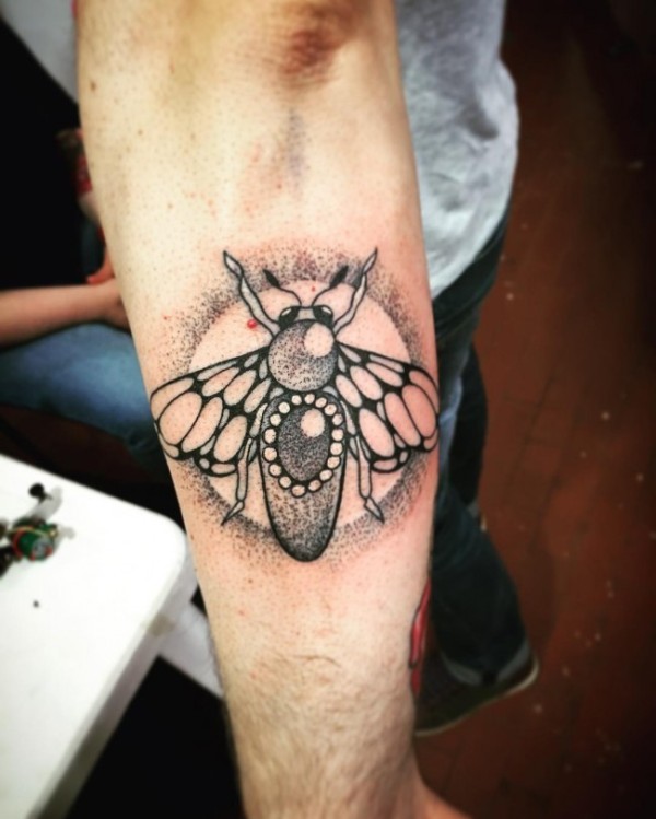手臂黑色点刺风格蜜蜂与珠宝纹身图案