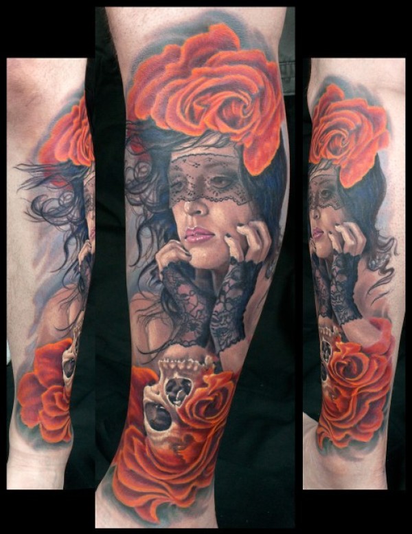 小腿写实风格美丽的女人与玫瑰和骷髅纹身图案