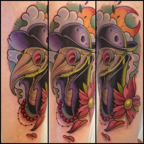 美丽的彩色鸟与帽子和花朵纹身图案